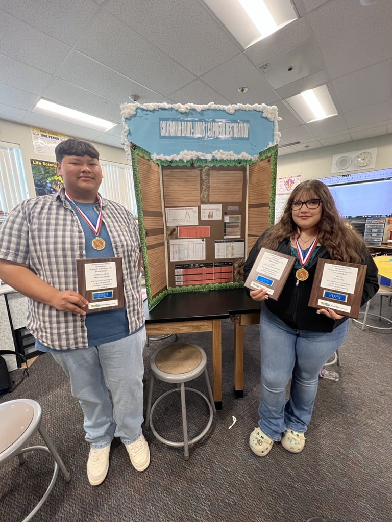 Marquez and Chaidez, who earned their spot in the state competition after winning the Tulare County Office of Education Science and Engineering Fair, competed in the Earth and Environment category. Over the course of two years, the duo and more than 30 of their classmates analyzed soil health, water quality, air quality and biodiversity at the former dairy, where its 500 acres are slowly evolving into a diverse habitat with native plants and animals.