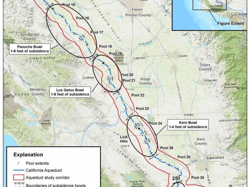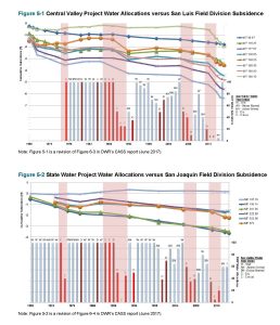 “Over the past several decades there has been a 10-fold increase in land planted in orchards and vineyards within the section of the Aqueduct study corridor that passes through western Fresno County, an area of well-documented historic land subsidence,” the report states. “Land planted in orchards and vineyards also has increased by a factor of four in western Kings and Kern counties, including parts of known subsidence bowls traversed by the Aqueduct.”
