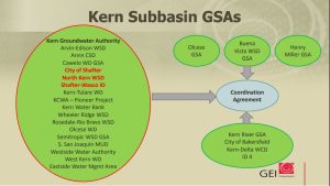 The Kern subbasin has different types of Groundwater Sustainability Agencies. Some are single-district GSAs, others are combined districts/municipalities and the Kern Groundwater Authority is an umbrella GSA with 16 member districts, which are each responsible for writing their own groundwater sustainability plans. They all have to coordinate methodology and data.