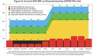 Using research from the California Environmental Flows Framework (CEFF), which analyzes river health, Duxbury said minimum flows in that stretch of river should be 195 cfs in winter, up to 335 cfs during spring runoff and 230 cfs by late summer. The CEFF review shows that at 79 cfs, the river habitat suffers “severe degradation.”