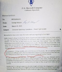 Valle noted another part of the March 28 Boswell letter took supervisors to task for ordering levee 749 cut on Boswell lands in order to relieve pressure on the Tule River, which was bursting its banks to the east and swamping thousands of acres of farmland.