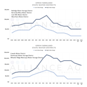 - Values for land in districts with State Water Project contracts remained relatively flat from the fourth quarter of 2023 through the second quarter of 2024 at between $5,000 and $2,000 an acre without groundwater (on Kern’s westside) and $14,000 and $2,000 an acre with groundwater.