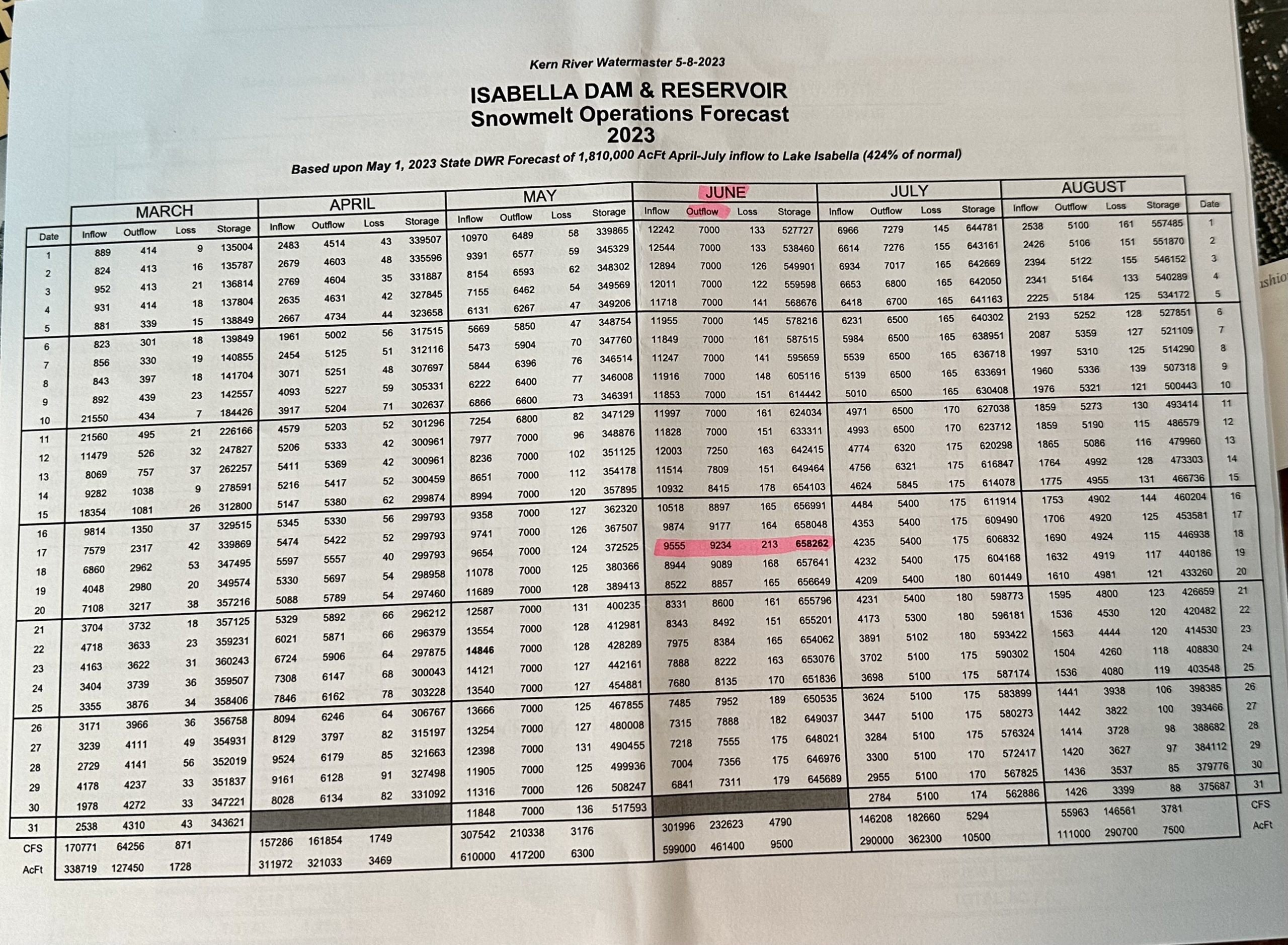 Lake Isabella is anticipated to fill beyond its maximum capacity, to 658,262, sometime in mid-June forcing outflows up to 9,234 cfs, according to a May 8 DWR estimate provided by Kern County Administrative Officer Ryan Alsop.