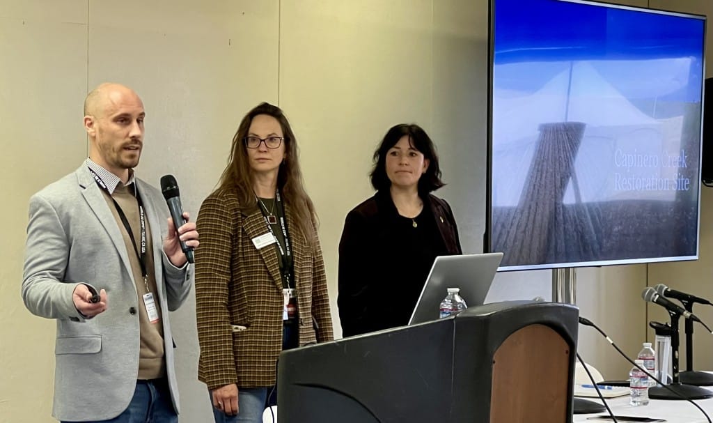 Nick Reed-Krase, executive director at the Tule Basin Land and Water Conservation Trust, speaks during a World Ag Expo seminar. On the right are Logan Robertson-Huecker of Sequoia Riverlands Trust and Abby Hart, of The Nature Conservancy. Lisa McEwen / SJV Water