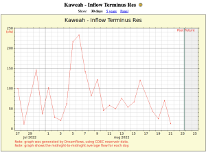 The Kaweah River, which flows into Lake Kaweah east of Visalia, saw a spike of inflow around August 6. Flows went from about 100 cubic feet per second (cfs) to nearly 250 cfs. But the effects disappeared fast. The flow dropped back down within two days and the river has seen, “nothing of significance,” from the rains, according to Mark Larsen, general manager for the Kaweah Delta Water Conservation District.