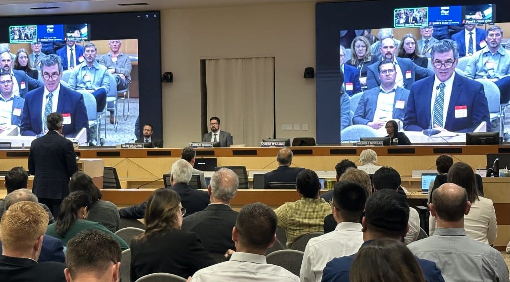 Tom McCarthy, former General Manager of the Kern County Water Agency, speaks before the Water Resources Control Board during the Kern subbasin hearing Feb. 20, 2025. Lois Henry / SJV Water