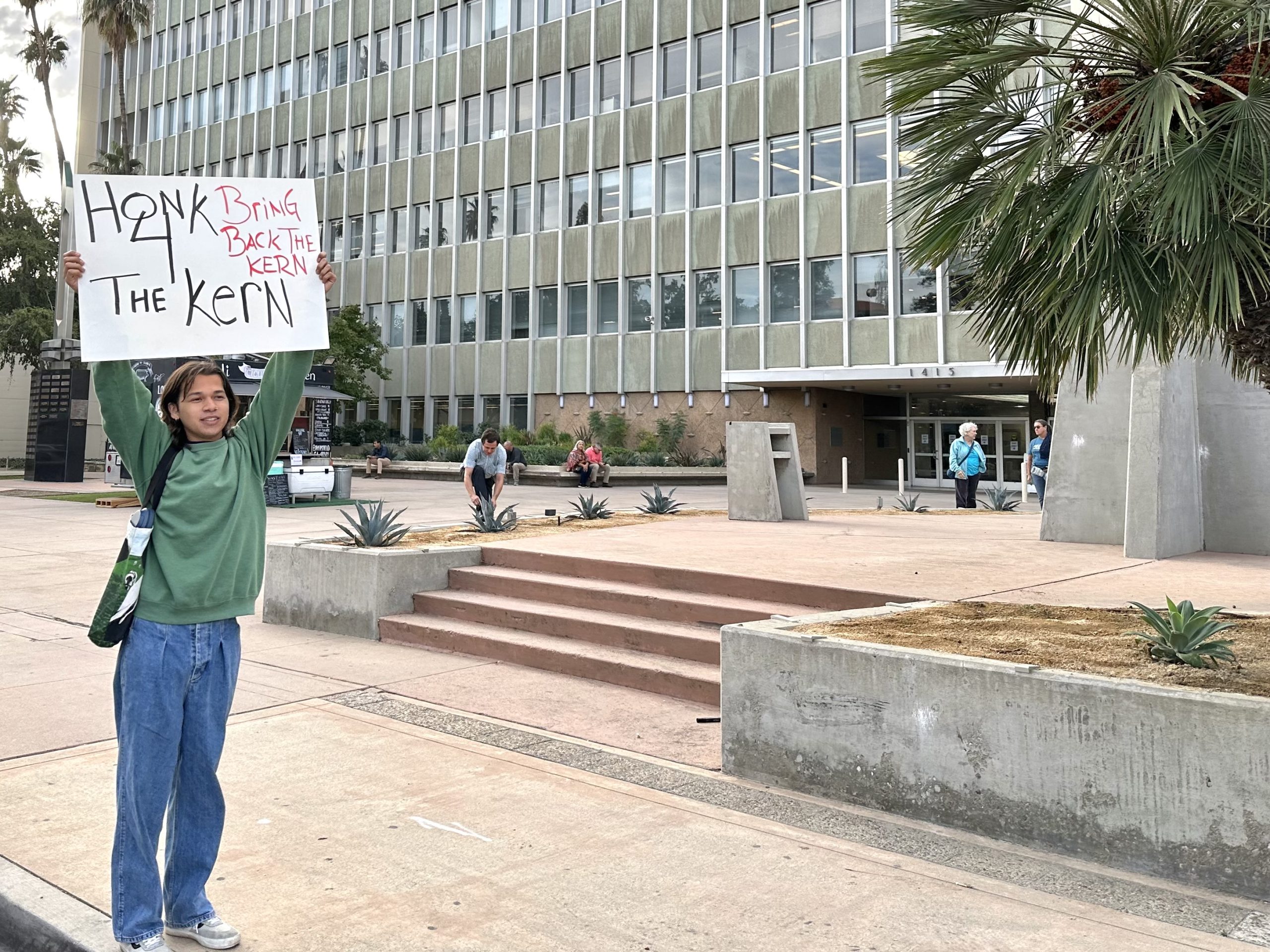 Kevin Moreno holds a sign asking motorists to honk in support of the Kern River. He attended a hearing Oct. 13, 2023 in Kern County on whether to grant an injunction that would cut back diversions from the river. Lois Henry / SJV Water