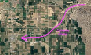 Typically, heavy rain years kick up water in the Caliente Creek and it comes rushing east out of the Tehachapi Mountains, turns south under Highway 58 into a wide wash and floods out Lamont. Years ago, the water would have spread out like a sheet and continued south toward Arvin. But farmers built a levee along Mountain View Road and lined it with tamarisk trees. The structure is easily spotted on satellite map views of the area.
