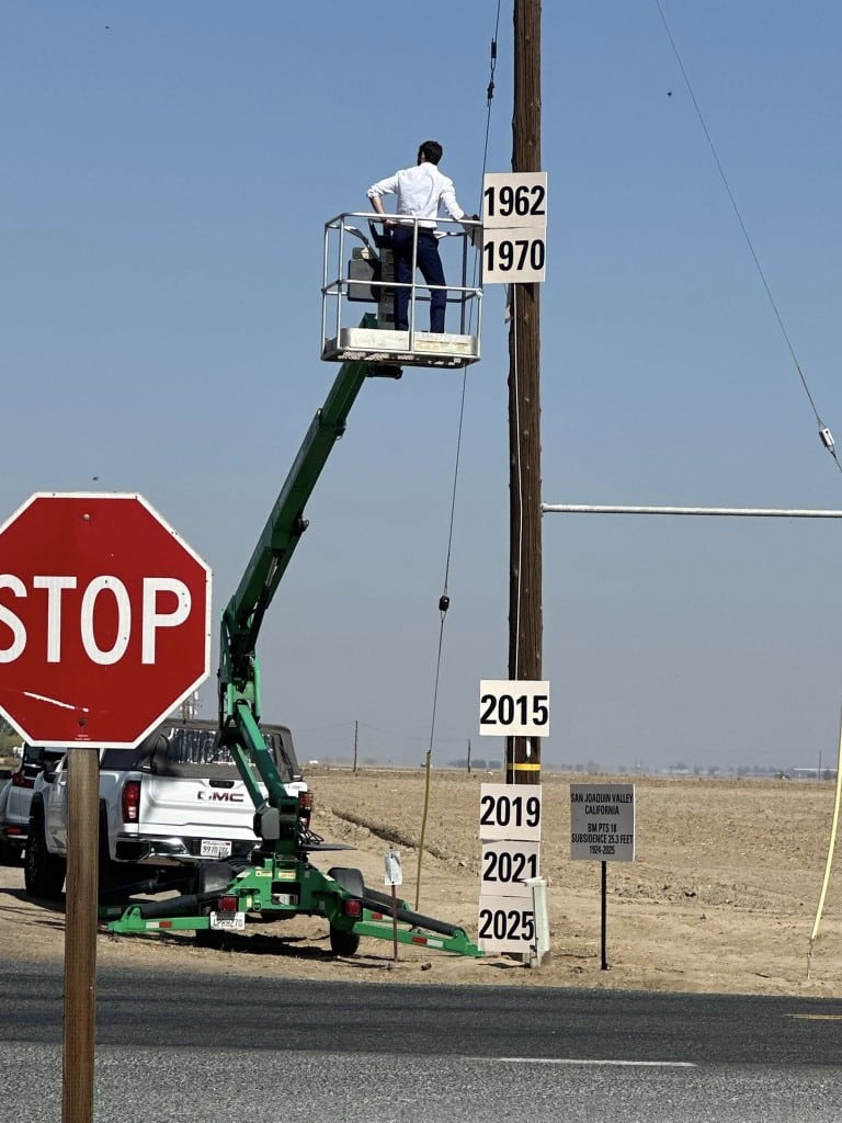 A man affixes signs to a telephone pole in Tulare County indicating how much the land has sunk over the years. SOURCE: Frank Fernandes’ Facebook page