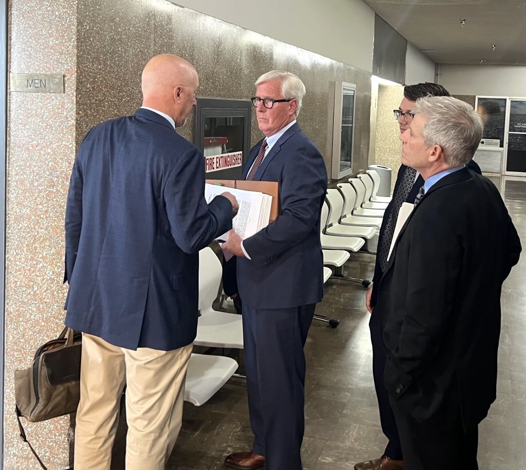 Attorney David Darroch, center, listens to attorney Alex Peltzer, back to camera, as attorneys William Mumby and William Marsh look on. Lisa McEwen / SJV Water